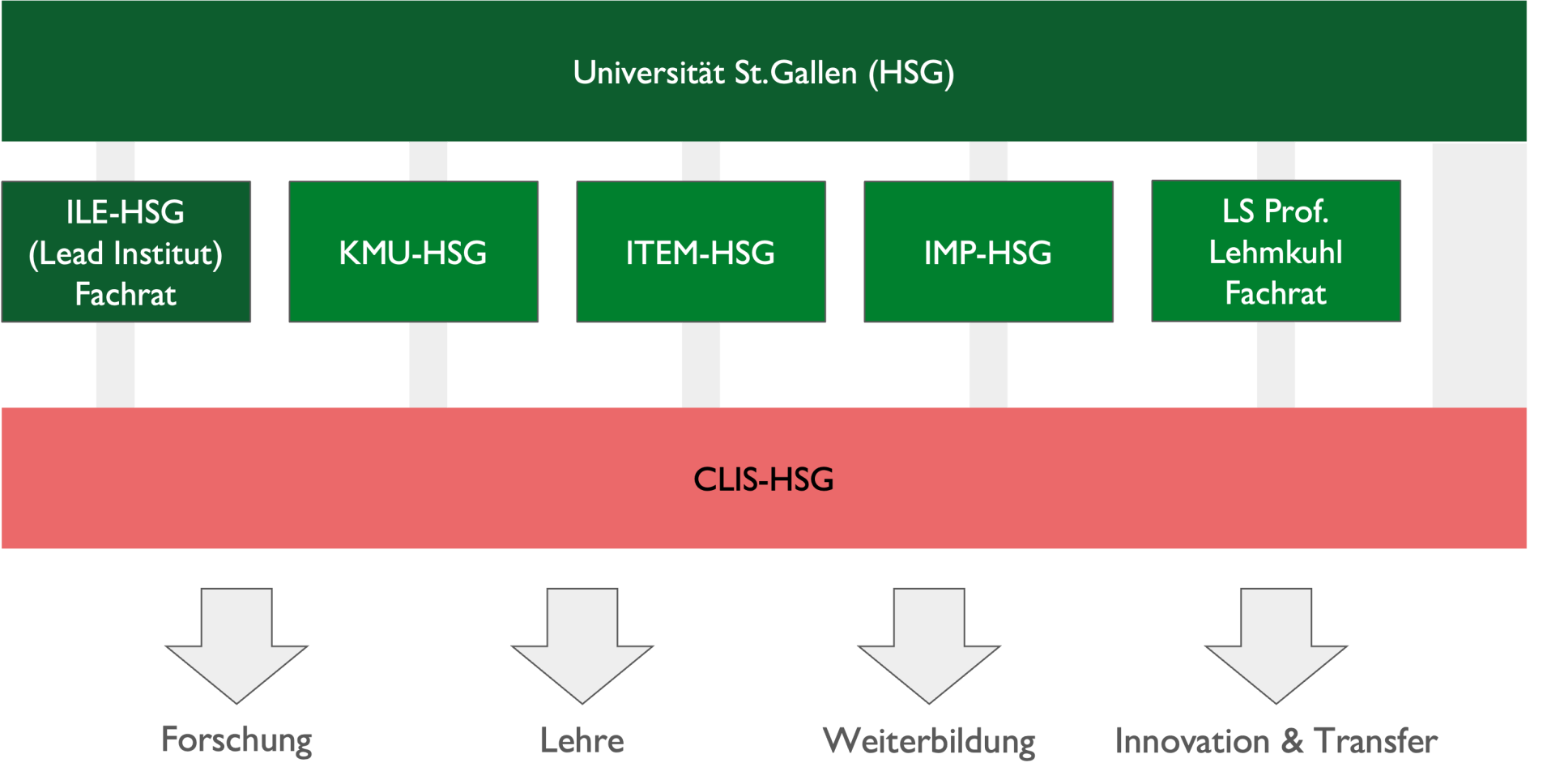Das CLIS-HSG ist breit in der Forschungslandschaft der Universität St. Gallen verankert und mit mehreren Instituten affiliiert: dem Institut für Law and Economics (ILE-HSG) als Leitinstitut, dem Schweizerischen Institut für KMU und Unternehmertum (KMU-HSG), dem Institut für Technologiemanagement (ITEM-HSG), dem Institut für Systemisches Management und Public Governance (IMP-HSG) sowie der School of Economics and Political Science (SEPS-HSG).