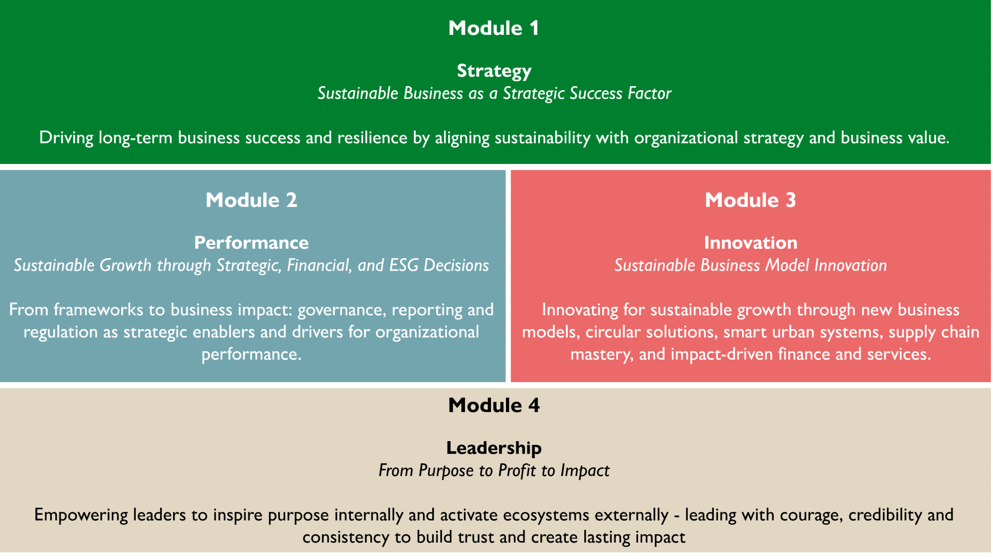 Das Programm unterstützt Sie dabei, die Denk- und Handlungskompetenzen zu entwickeln, um nachhaltige Geschäftsinnovation als zentralen Bestandteil langfristiger Wertschöpfung und positiver Wirkung zu etablieren.